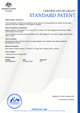 该发明于2021年5月获国内发明专利授权,2022年9月陆续获得国际授权,提出了一种综采工作面测量机器人装置和自动测量系统,测量机器人组成部分包括:吊笼、全站仪、棱镜、工控机。将具备自动整平功能的吊笼固定吊装在液压支架顶梁上,然后将全站仪、工控机固定在吊笼中,最后将带插接件的棱镜和全站仪底座对接,形成一个测量机器人装置。根据矿井综采工作面起伏,沿综采工作面依次布设多个测量机器人,且相邻的测量机器人通视,构成矿井覆盖综采工作面的自动测量系统。通过所述综采工作面测量机器人装置和自动测量系统实现了矿井综采工作面固定和移动目标的精确大地坐标测量。