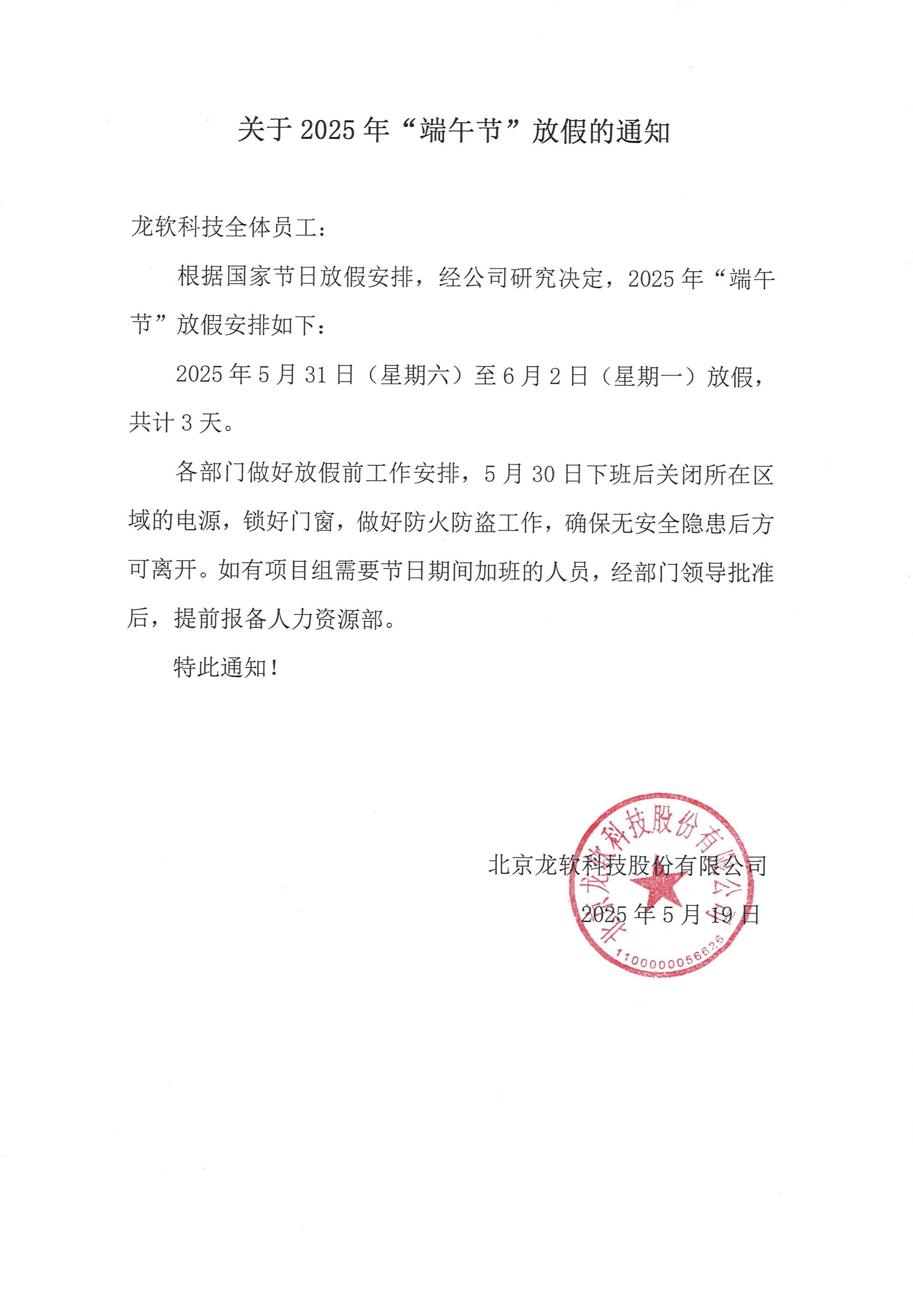 关于2025年“端午节”放假的通知