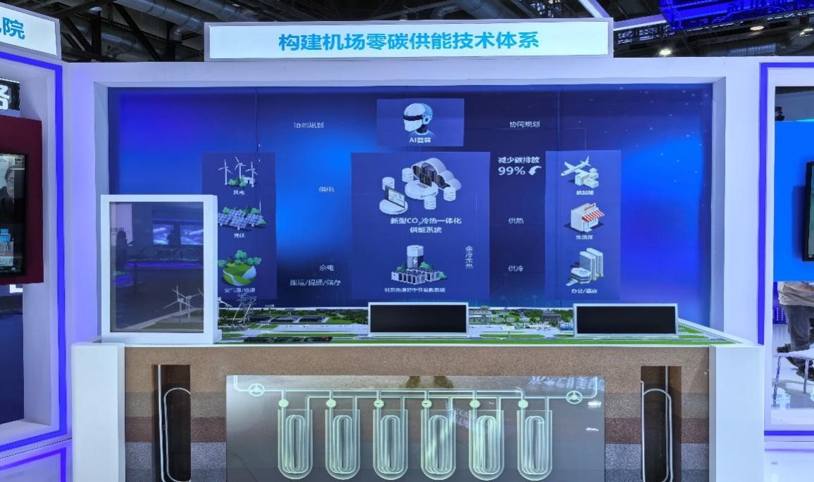鄂尔多斯零碳机场项目由北京大学鄂尔多斯能源研究院首席科学家张信荣教授团队领衔设计,聚焦绿色能源、技术创新、智慧管理等领域,以二氧化碳冷热工质为基础,融合光伏发电、电池及地源井储能和综合能源管理等多重技术,构建“光储充绿电+二氧化碳冷热一体化+创新地源+新型空气能+跨季节储能+AI智算”供能体系,成功实现航站楼100%零碳供能。
