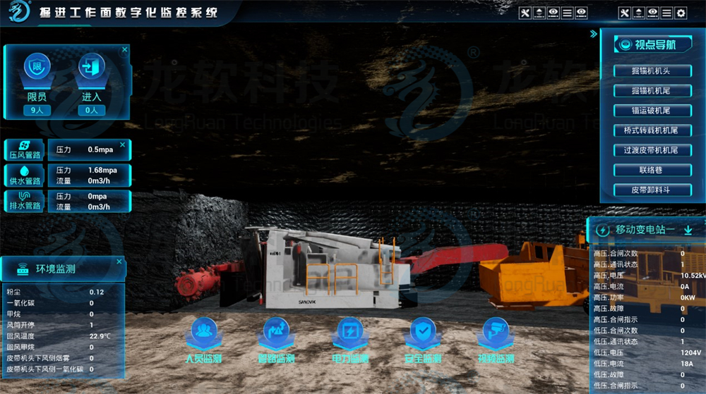(5)多元信息融合联动分析功能。实现掘进机及后配套设备的空间位姿、运行信息的融合联动;具备掘进工作面环境(粉尘、瓦斯、水等)监测数据融合功能,并具备监测环境数据智能分析。