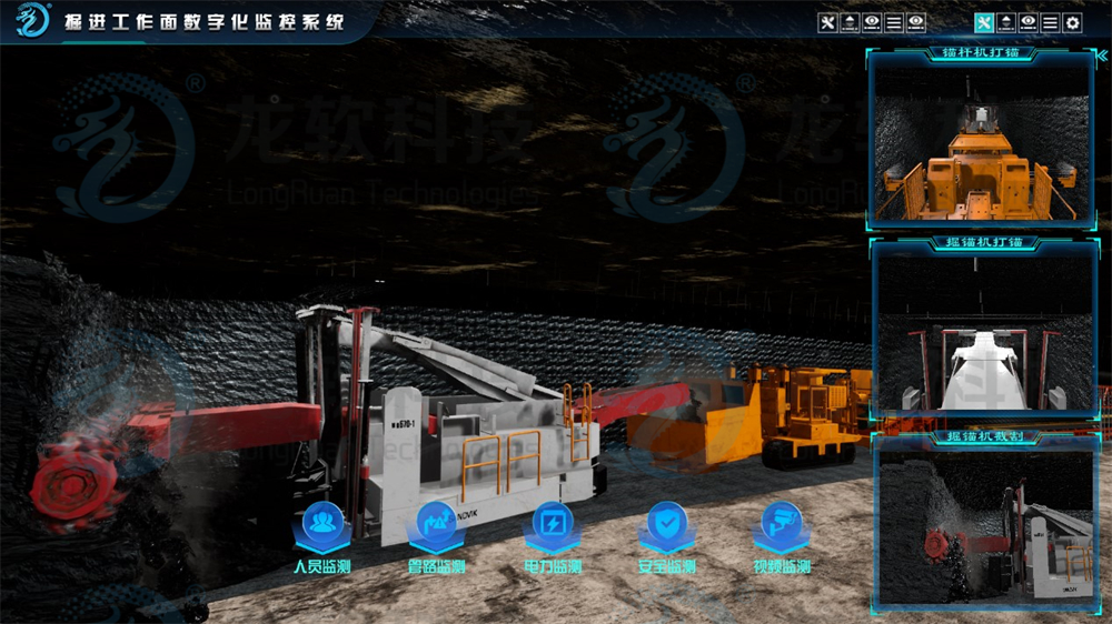 (1)三维可视化平台的集控功能。具有监测巷道掘进与支护平行作业、监控快速成巷的三维可视化表达功能,现场操作人员在巷道远端或地面实现远程操控截割,具备对巷道掘进设备实现一键启停控制。