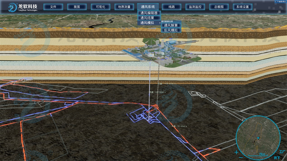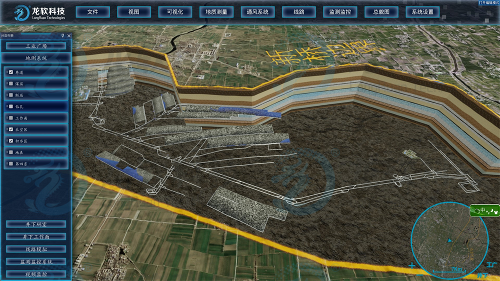 基于TGIS+BIM技术的透明化矿山系统融合多源数据,利用虚拟现实仿真技术,可视化展现矿山井上下全貌。该平台基于灰色地理信息系统理论,设计了适应煤炭行业特点的地理信息系统数据模型和数据结构,特别是具有煤矿特色的断层、巷道、地层的拓扑数据结构。系统全面构建了矿井采、掘、机、运、通各专业子系统的仿真场景,实现全矿井“监测、控制、管理”的一体化,最终实现基于二维TGIS和4D-GIS的一体化综合管理系统,为煤矿安全生产管理提供保障。