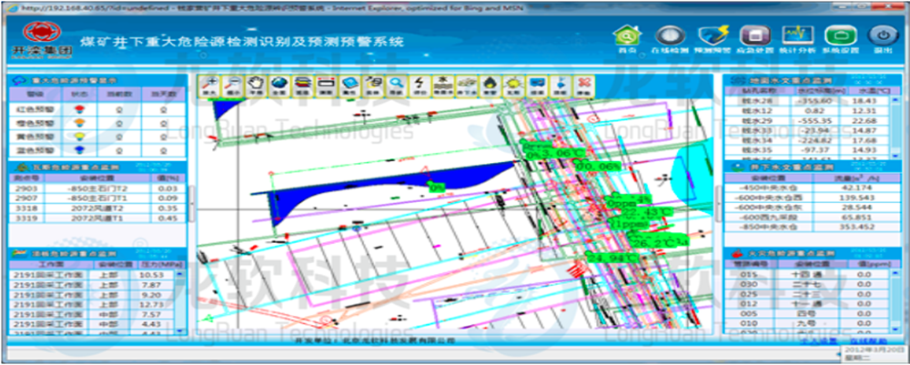 基于煤矿水、火、瓦斯和顶板等安全监控系统,实现重大危险源在线检测,实时采集重大危险源数据,建立重大危险源指标体系库,运用先进的预警模型,实现对煤矿井下水、火、瓦斯和顶板等重大危险源的集成管理和超前预警。提高煤矿重大危险源预警能力,降低重大危险源事故发生率,进而提高煤矿整体安全管理水平。