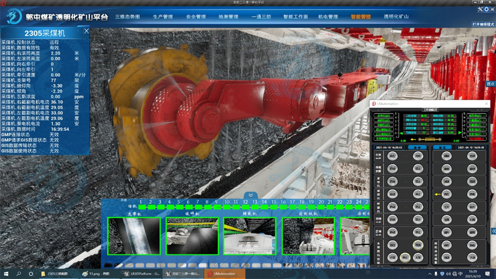 (1)建立透明化工作面。基于TGIS+BIM技术以及三维地质模型、设备模型、逻辑处理算法,形成多维可视化数字孪生系统,为实现综采设备的实时数据展示、空间位置关联互动、虚拟仿真与远程控制提供可视化开采场景。
